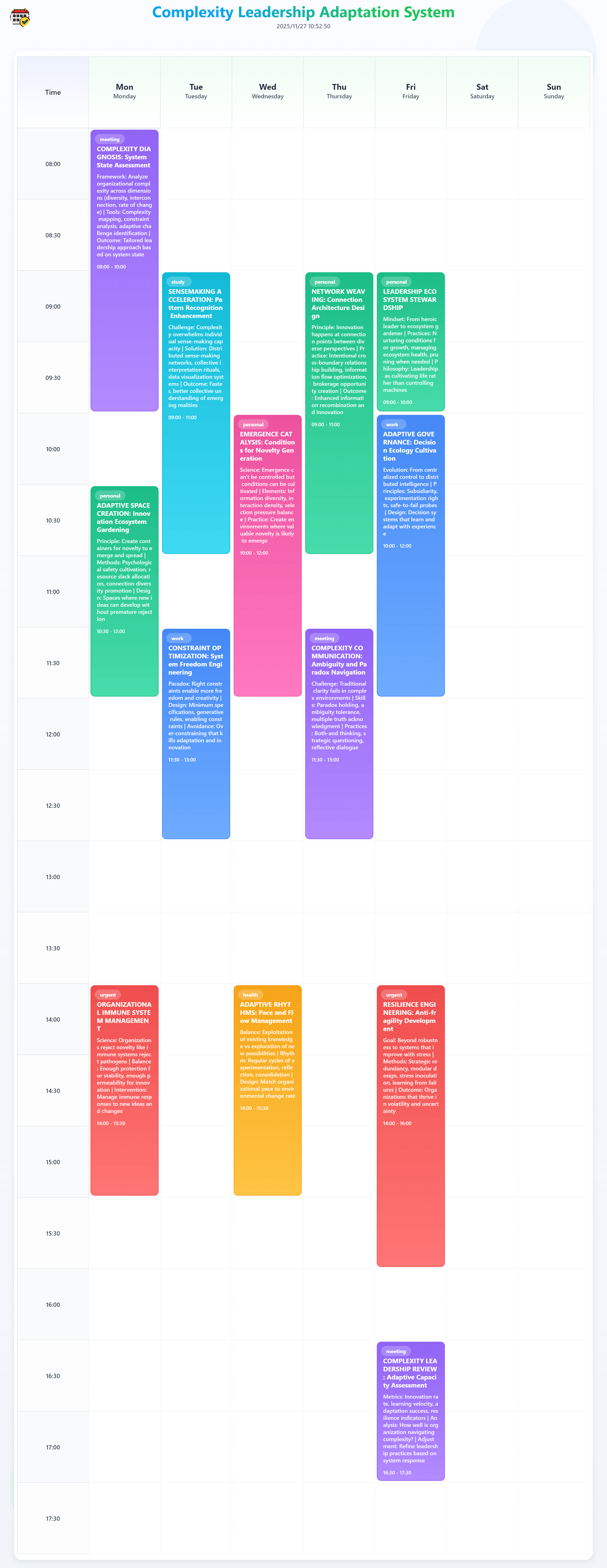 Lead in complexity without control illusions. This system uses complexity science to build adaptive organizations, balance organizational immune responses, and create conditions for emergence and innovation.